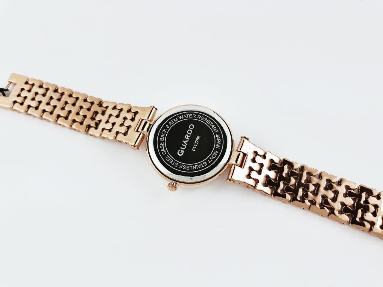 Bransoleta damskiego zegarka Guardo ułożona jest z rzędu eleganckich kulek. Oryginalny design podkreśla tłoczona tarcza. Dostępny w kilku wariacjach kolorów złotego i srebrnego, zawsze w firmowym pudełku Guardo.